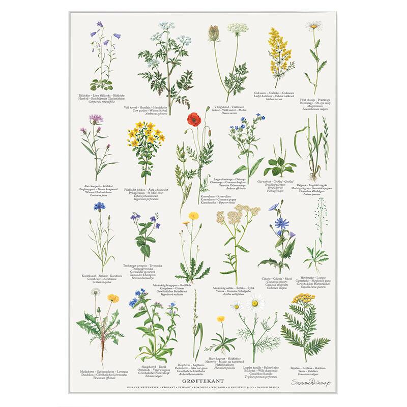 Do you recognize the flowers from the roadside verge and know their names? If not, this new poster is a great opportunity to learn them. Susanne Weitemeyer has illustrated 23 plants as you can find them along Danish roadside verges. The names on the poster are in Danish, Swedish, Norwegian, English, German and Latin.