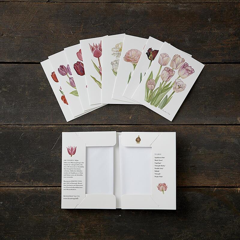 The card folder contains 8 envelopes and 8 different folded cards with tulip motifs.
