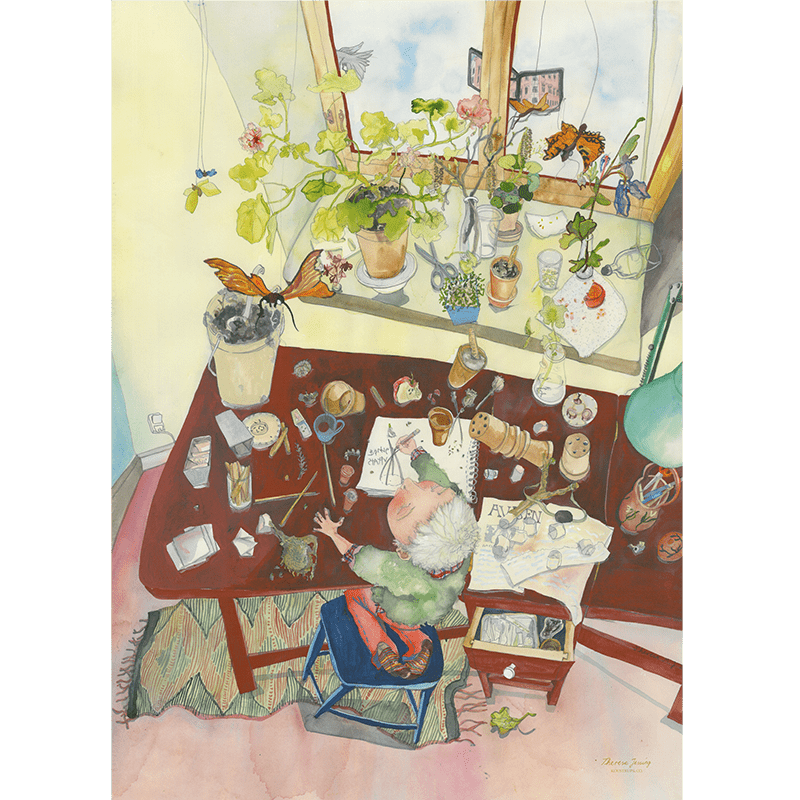 A quiet moment by the window. In Nature Study Theresa Jessing has created a sensitive and atmospheric scene: a boy sits absorbed in his notebook, surrounded by plants and natural light. It's an image of curiosity and presence – a quiet tribute to childhood wonder and the small details of nature.
