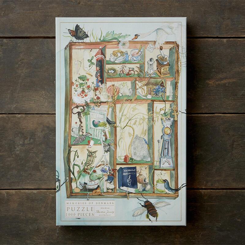Beautiful puzzle titled "Pieces of Denmark". The puzzle is illustrated by Theresa Jessing and shows some of Denmark's most charming icons arranged in a pretty display box. You can find, among other things, the folk high school songbook, H.C. Andersen's fairy tales, strawberries with cream and much more. Explore the lovely motif and discover more delightful details.